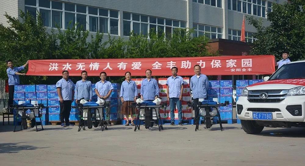 安陽全豐在自身蒙受財產(chǎn)損失的情況下,不忘企業(yè)使命,勇于承擔(dān)社會責(zé)任,心系受災(zāi)地區(qū),開展生產(chǎn)自救的同時,公司董事長、總經(jīng)理王志國第一時間帶領(lǐng)員工積極籌措物資,緊急行動起來,聯(lián)系湯陰縣、安陽縣、北關(guān)區(qū)、文峰區(qū)當(dāng)?shù)丶t十字會,向受災(zāi)嚴(yán)重地區(qū)捐贈施必達(dá)、金處方、S誘抗素、“蚊蠅一夏凈”等物資將近50余萬元,并免費提供配套的無人機(jī)消殺服務(wù)。